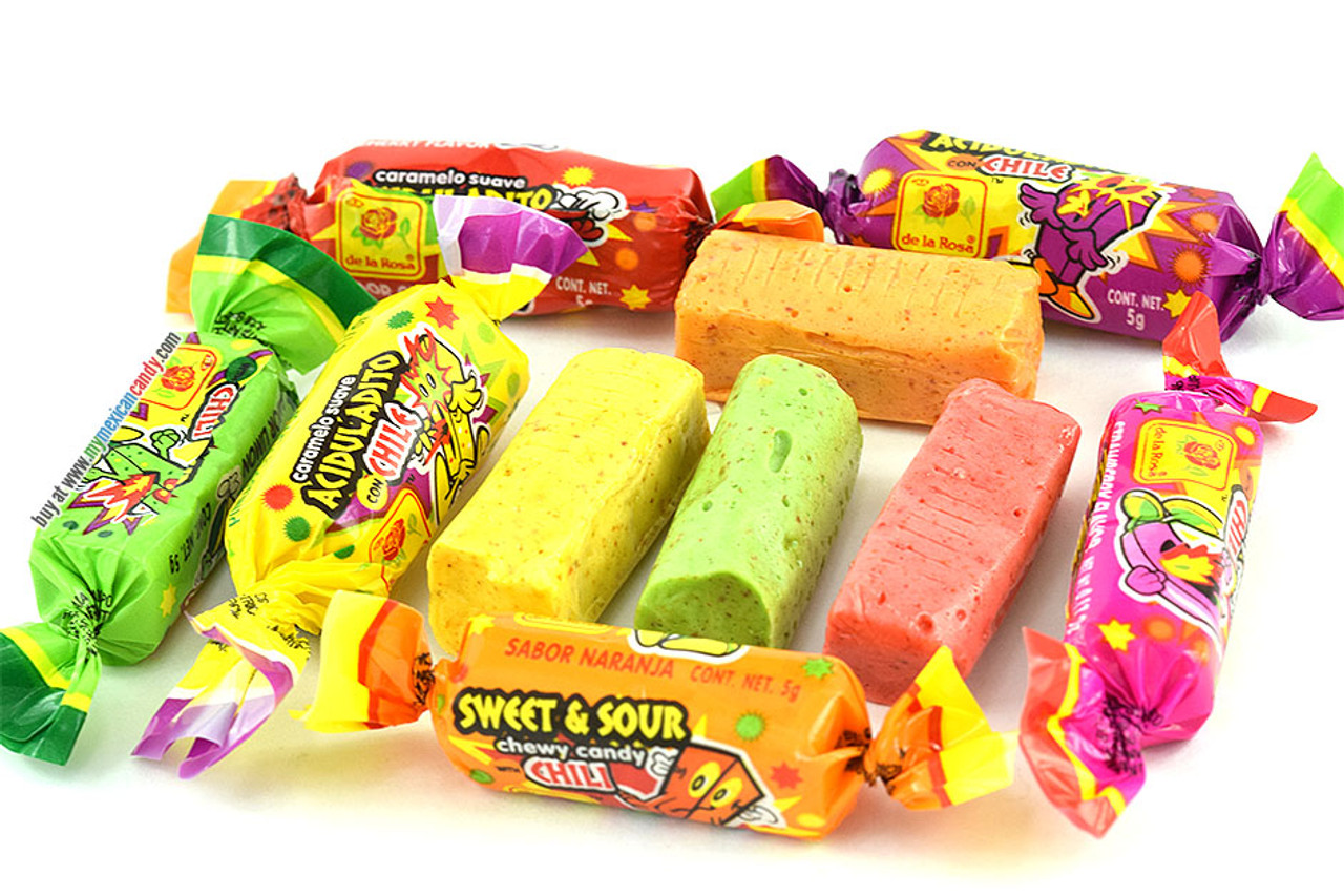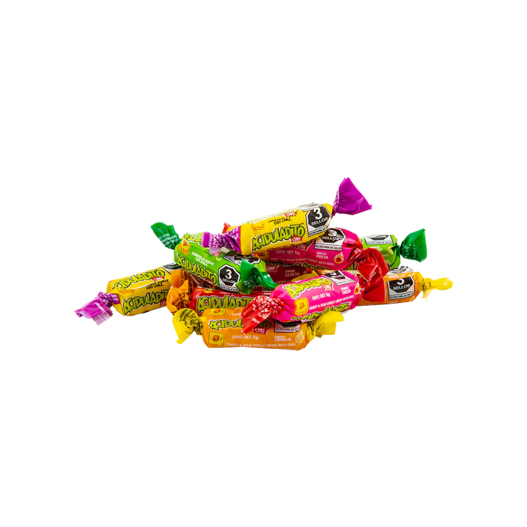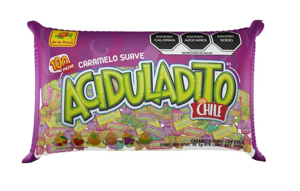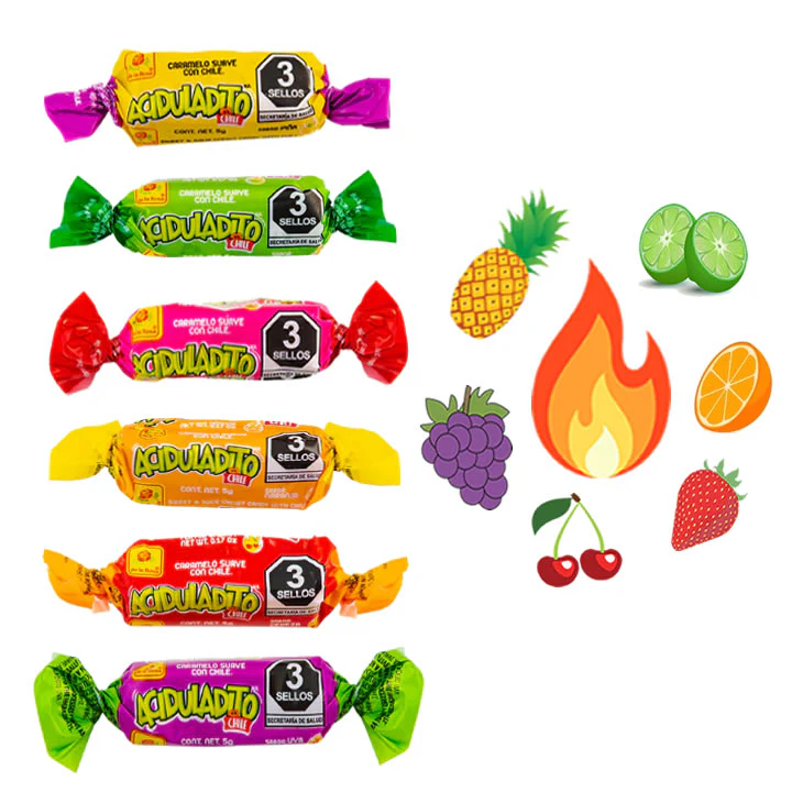 Caramelo suave y acidito con chile. Sabores artificiales. Paquete de 100 piezas de sabores mixtos. Peso del paquete 500 g (17.8 oz). Dulce acidito para tu paladar