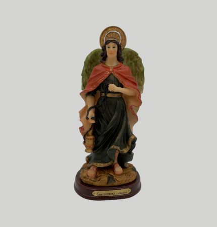 imagen de material resina. Arcángel saltiel. Tamaño 8.5 pulgadas de alto por 3 pulgadas de ancho. Peso 13 oz