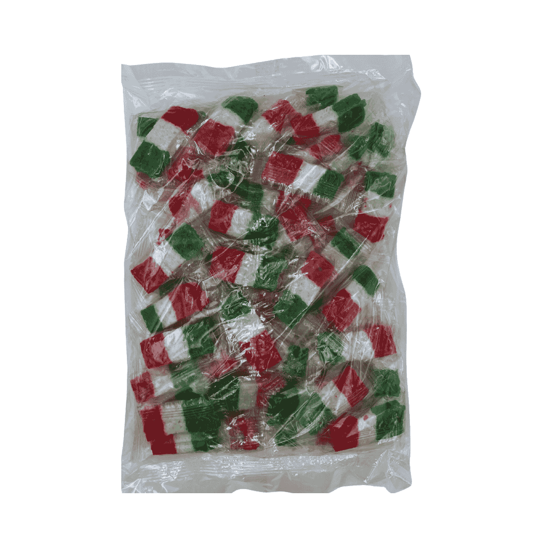 Dulce clasico de coco con colores basados a la bandera mexicana. Paquete de 50 ct con envoltura individua. Peso de paquete 500grs.