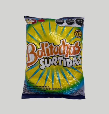 caramelo macizo acidulado sabores sandia, mango, pina, fresa, tamarindo y frutas tropicales, relleno y cubierto con chile en polvo. Paquete de 60 piezas. Peso del paquete 540 g (1.3 lb)