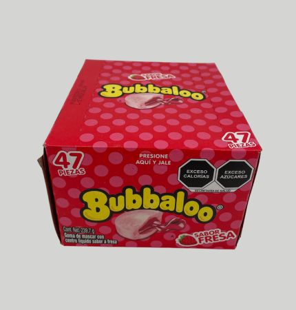 goma de mascar con centro relleno de fresa. Paquete de 47 piezas. Peso del paquete 239.7 g