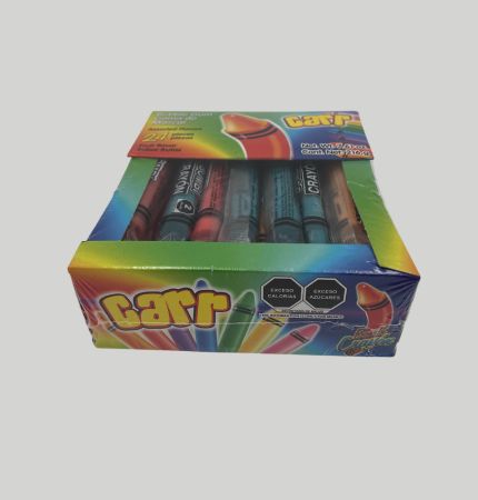 goma de mascar en forma de crayones,24 piezas en diferentes colores, sabores frutales. Peso del paquete 216 g