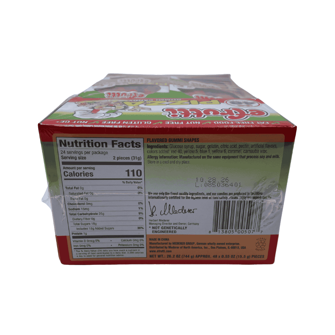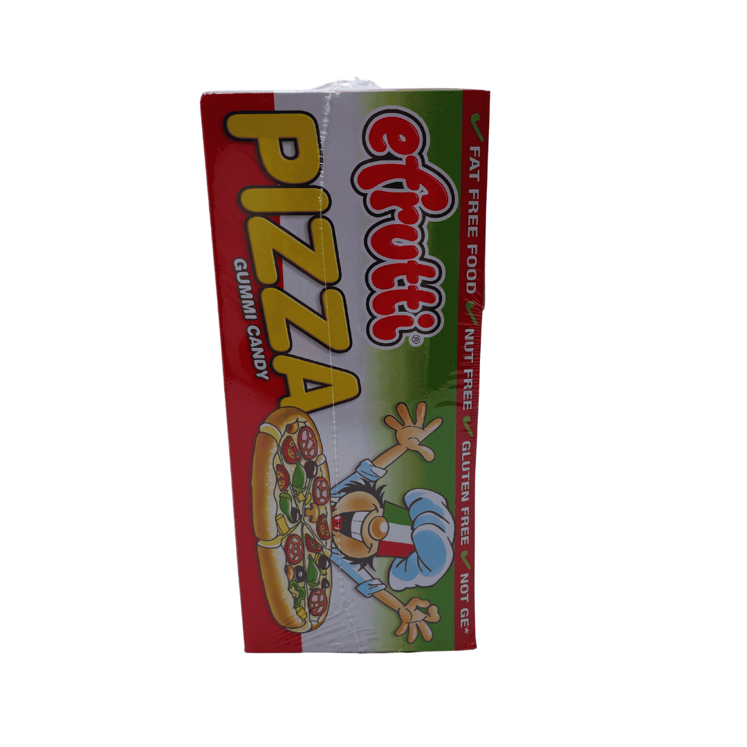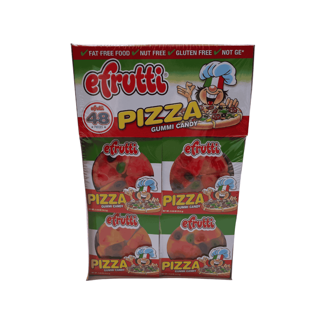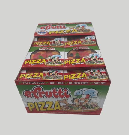 gomas individuales en forma de pizza. Sabores artificiales. Paquete de 48 piezas de 0.55 oz. Peso del paquete 744 g (26.2 oz)