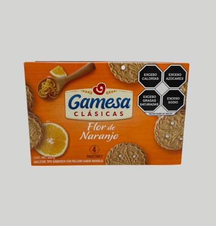galletas tipo sandwich con relleno sabor naranja. Caja con 4 paquetines. Peso de la caja 600 g.