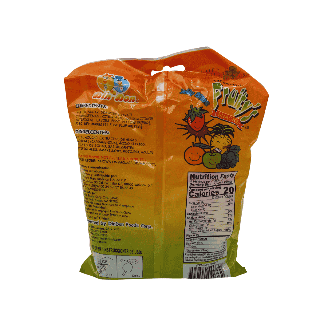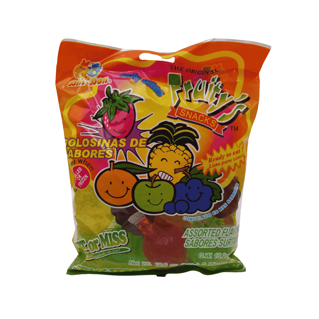 golosina tipo gelatina, sabores frutales. Paquete de 9 piezas de 40 g cada una. Peso del paquete 360 g (12.6 oz)