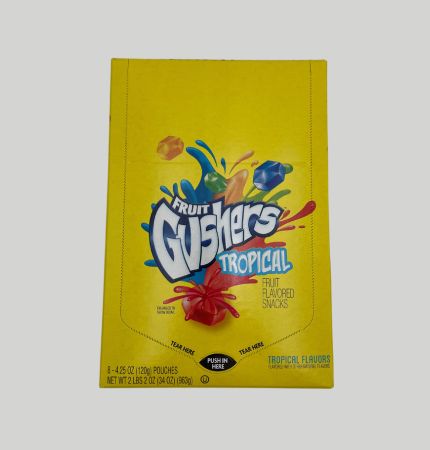 golosina de frutas, suaves y masticables con centro liquido. Sabores tropicales. Paquete de 8 bolsitas de 4.25 oz (120 g). Peso del paquete 2 lb, 2 oz (34 oz)