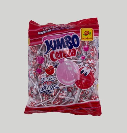 paleta de caramelo rellena de goma de mascar sabor cereza. Bolsa de 50 piezas de 19 g. peso del paquete 950 g (33.51 oz )