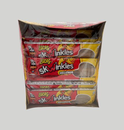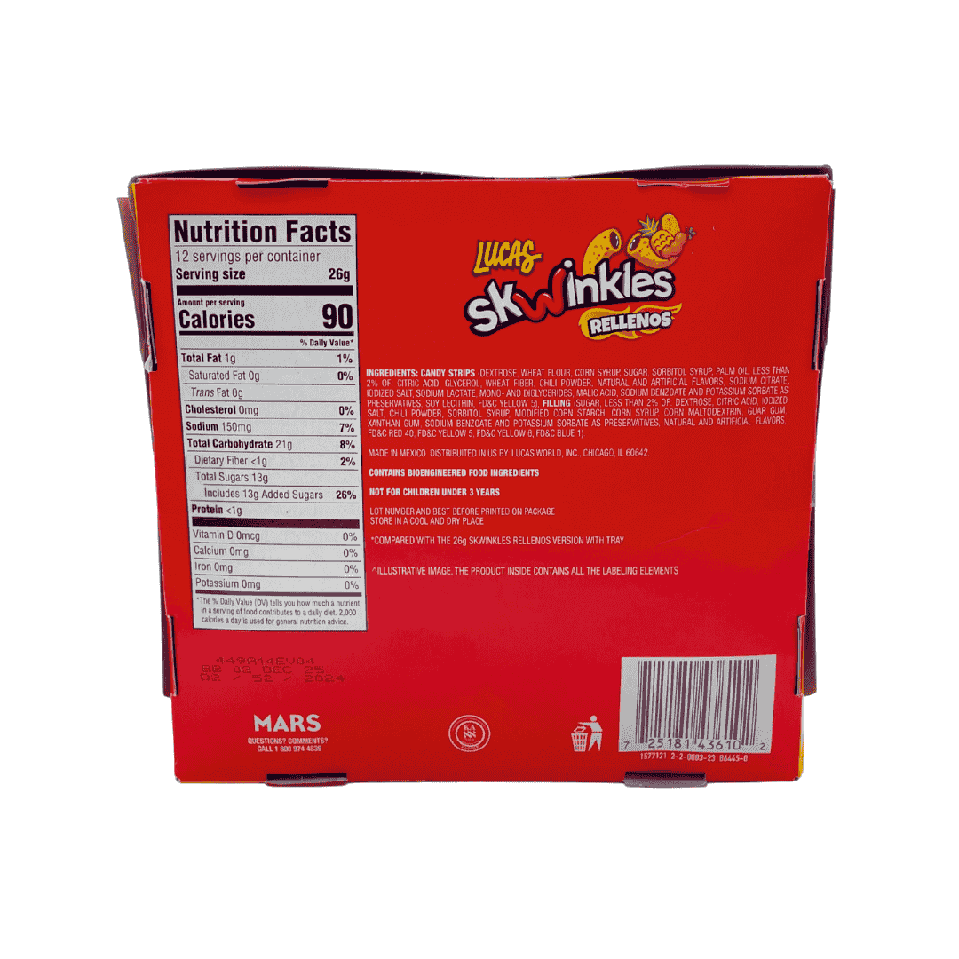 dulce enchilado en tiras sabor pina con relleno sabor tamarindo. Contenido 12 piezas de 0.92 oz (26 g). Peso del paquete 11.04 oz (312 g)