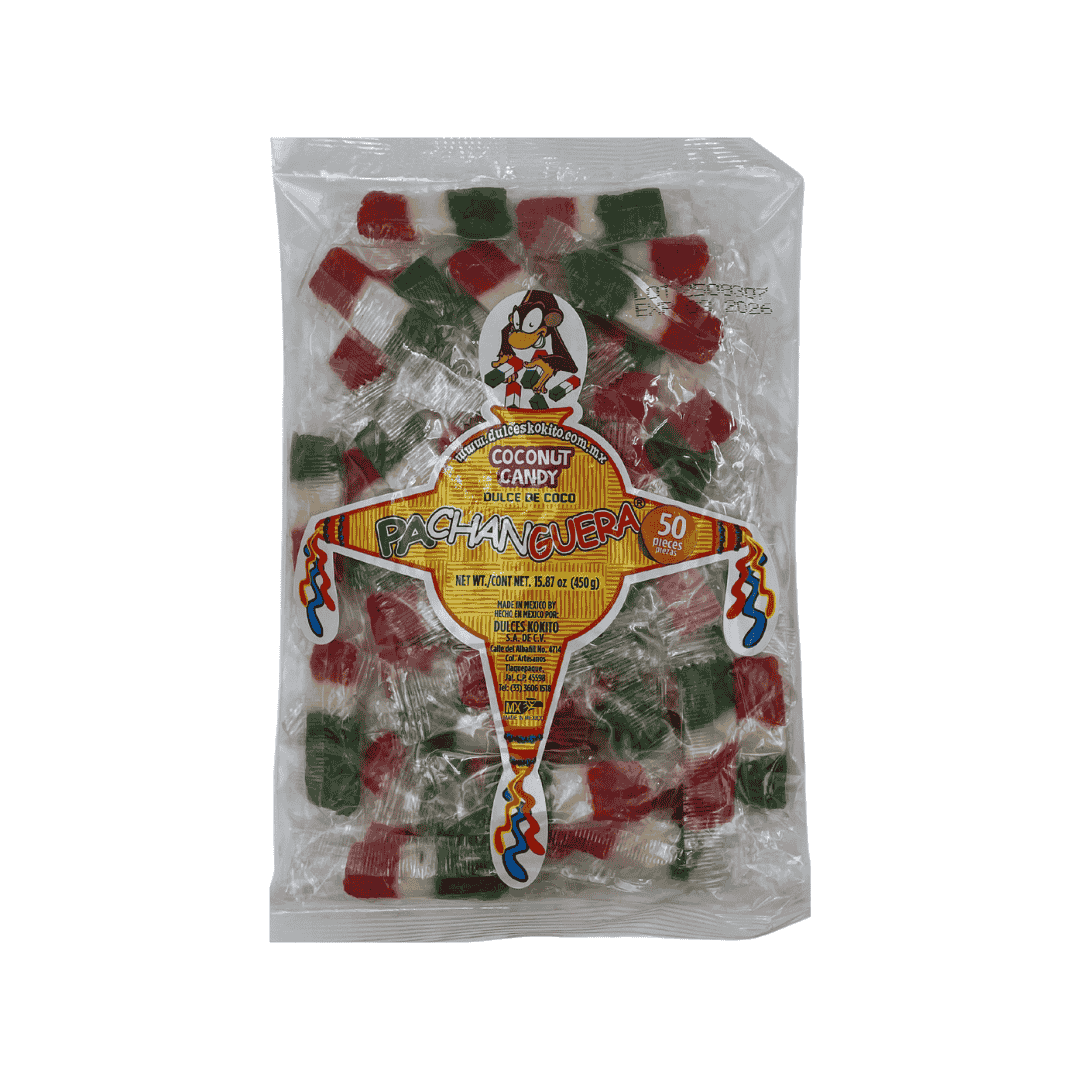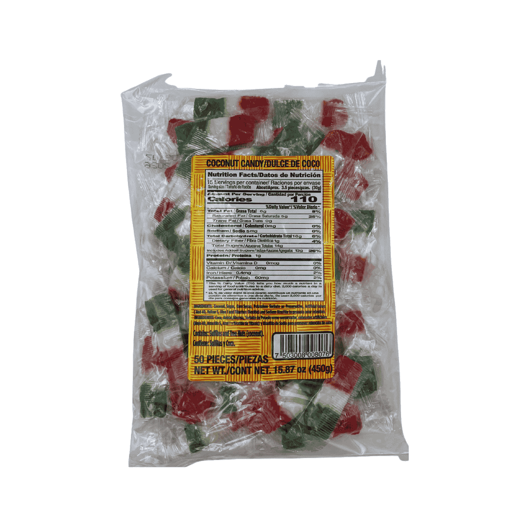Paquete con mini barritas de coco tricolor , envueltas individualmente, perfecto para compartir. Paquete con 50 piezas. Peso del paquete 450 grs.
