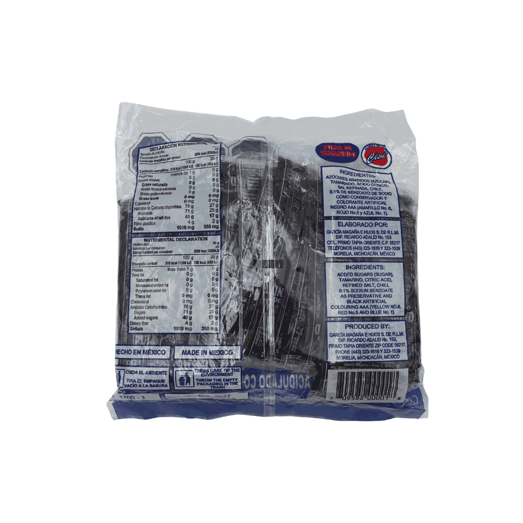dulce de tamarindo acidulado con sal. Paquete de 20 piezas de 35 g cada una. Peso del paquete 700 g
