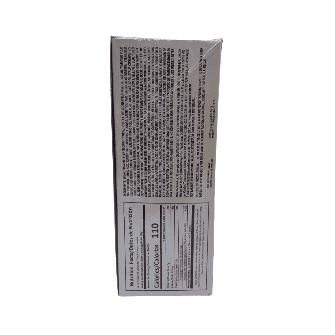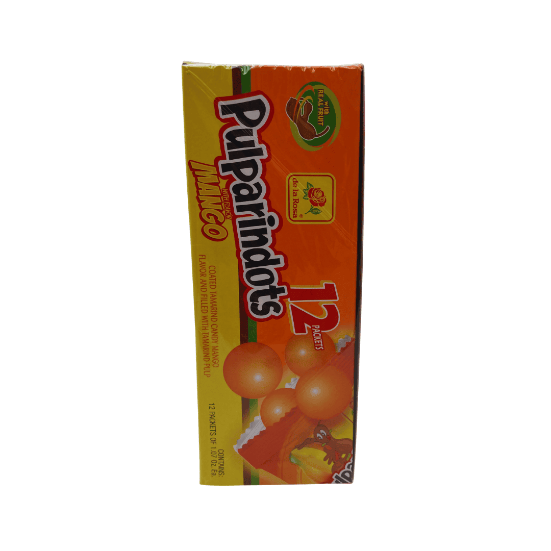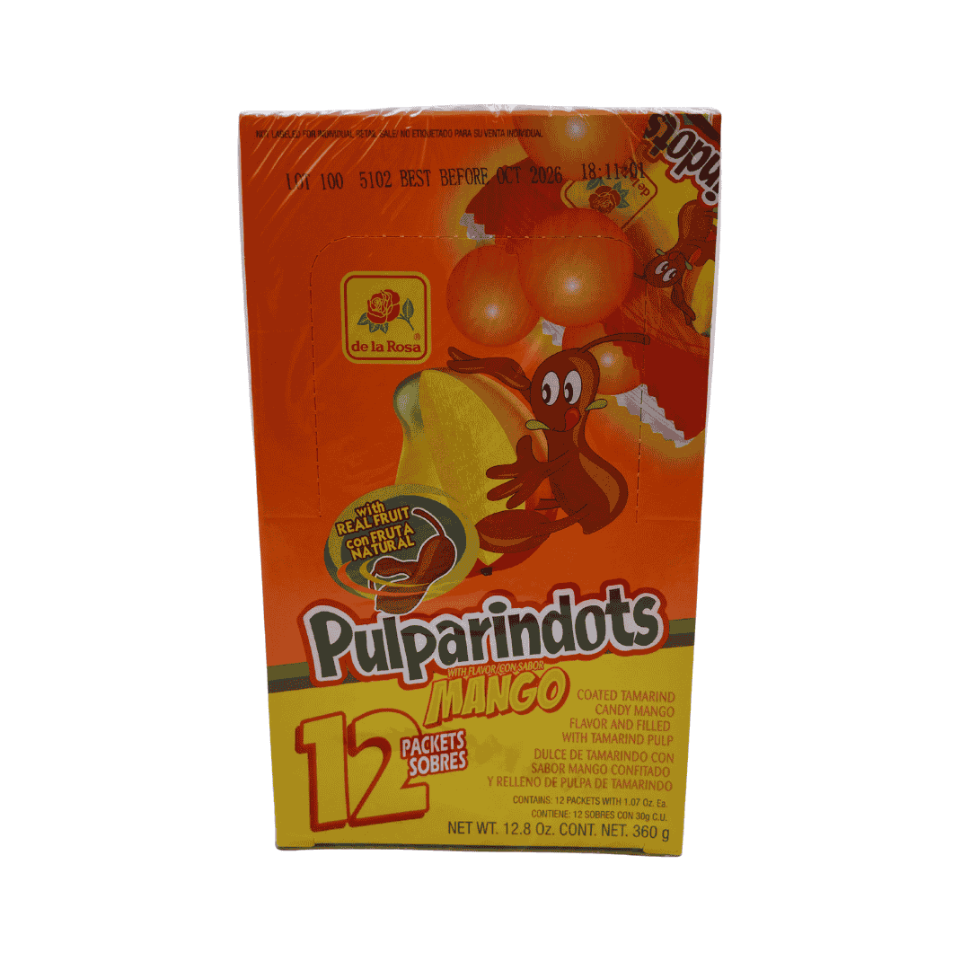 dulce de tamarindo confitado con relleno de pulpa de tamarindo. Sabor mango. Paquete con 12 sobres de 30 g (1.07 oz). Peso del paquete 360 g. (12.8 oz)