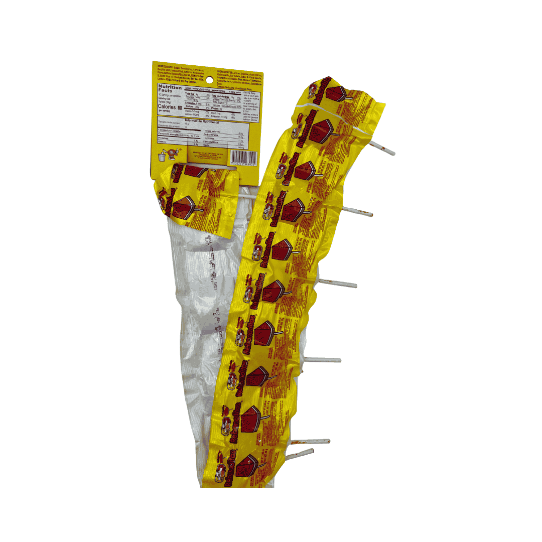 paleta de caramelo macizo acidulado sabor sandia cubierta con chile en polvo. Ristra de 10 piezas. Peso del paquete 160 g (5.6 oz)
