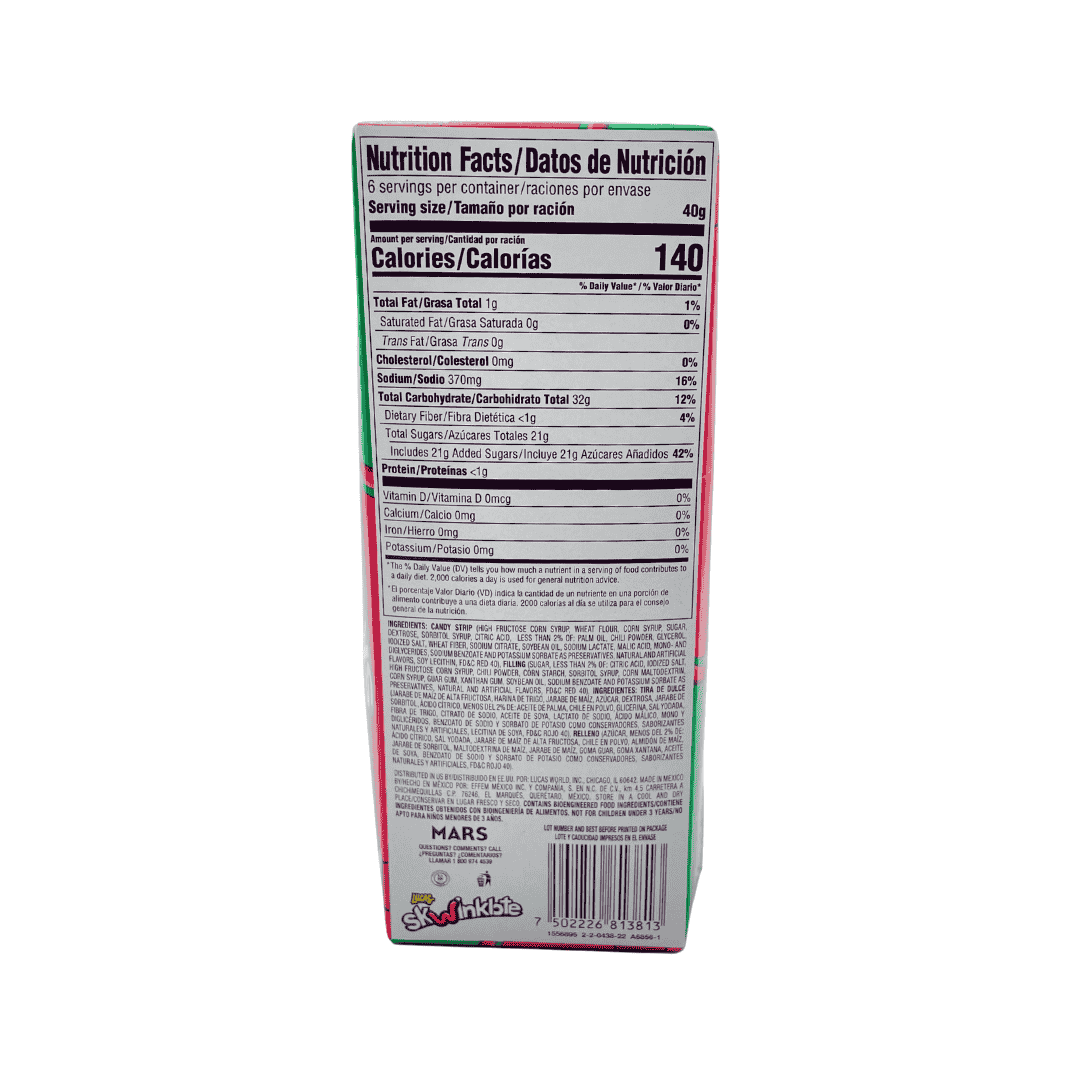 dulce enchilado en tira con relleno sabor sandia. Contenido 6 piezas de 1.41 oz (40 g) cada una. Peso del paquete 8.46 oz (240 g)