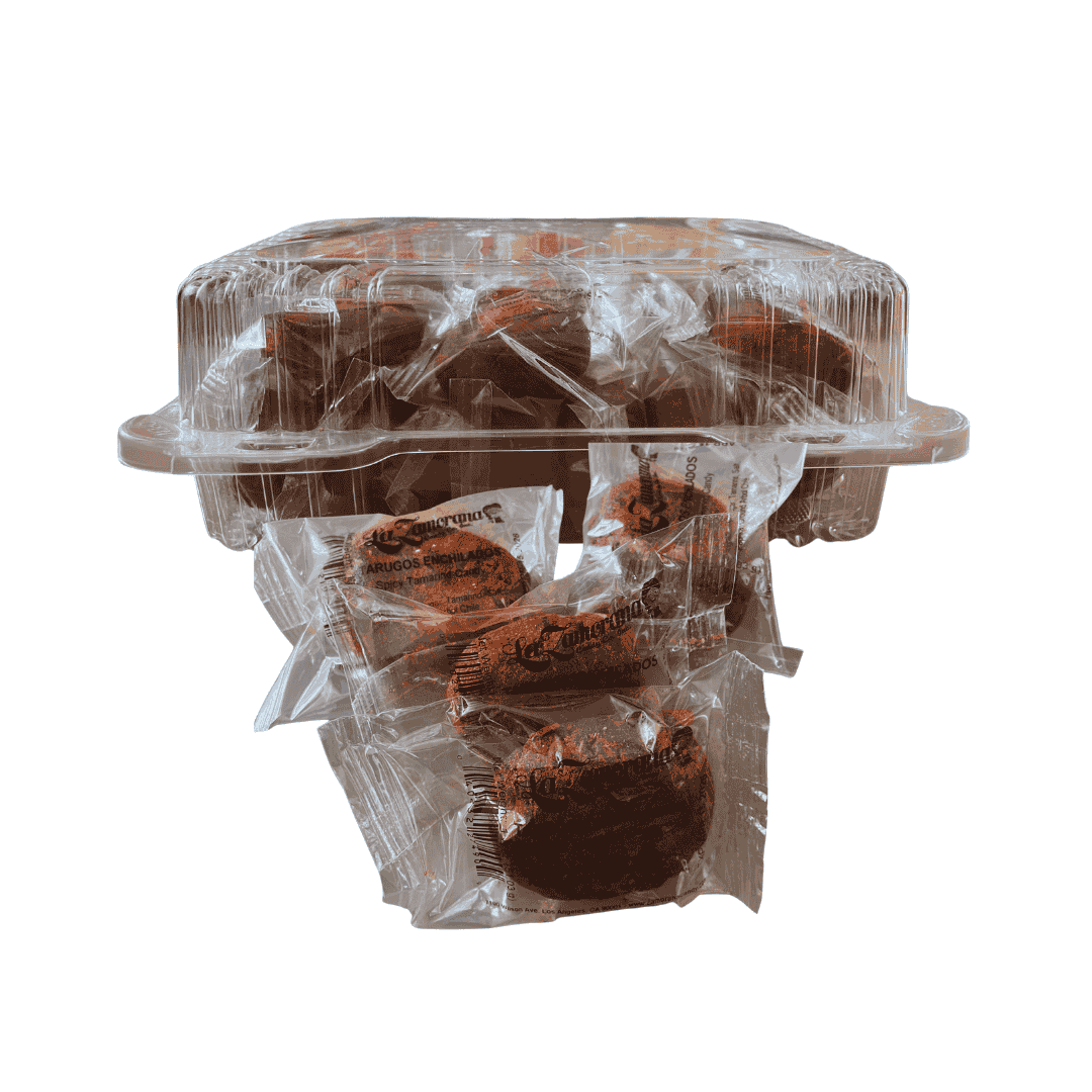 Dulce de tamarindo enchilado y saladito. Suave para un antojo picoso. Container con 20 piezas. Contenido Neto 2.5 Lbs.