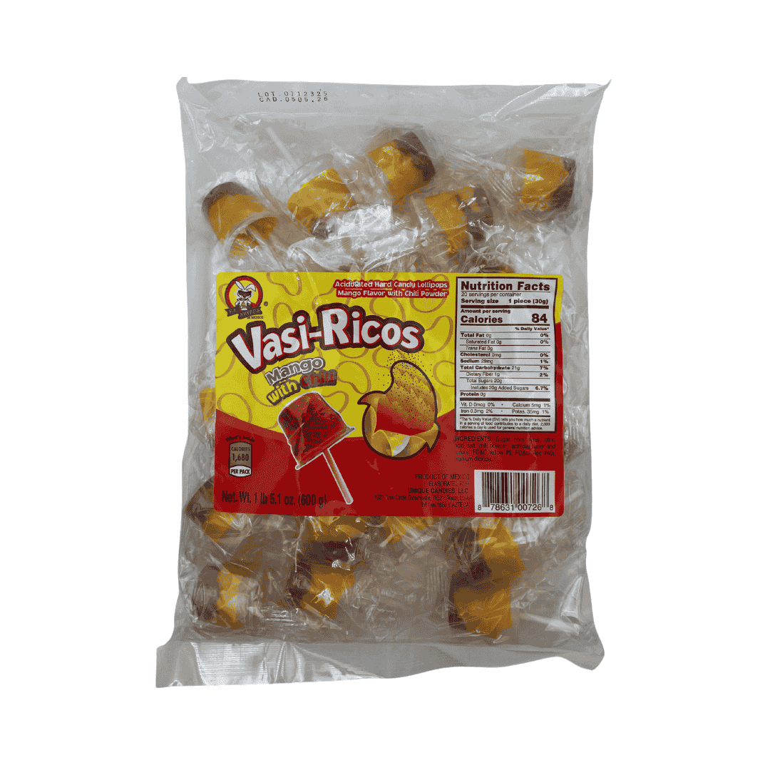 paleta de caramelo macizo, acidulada sabor mango con chile. Paquete de 20 piezas. Peso del paquete 600 g (1 lb, 5 oz)