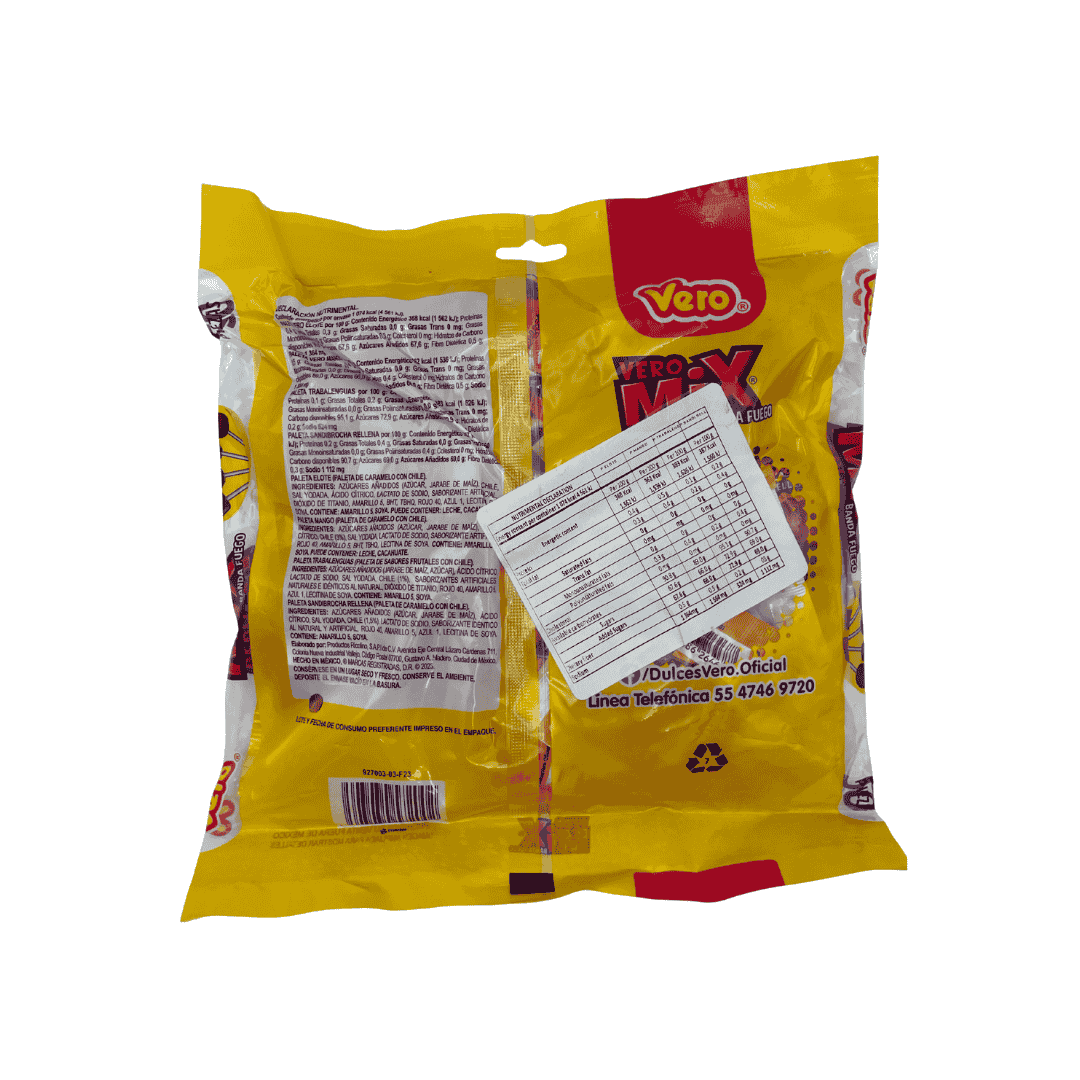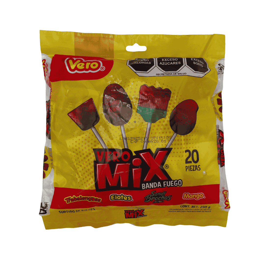 paletas de caramelo macizo, sabores fresa, mango y sandia cubiertas de chile. Paquete de 20 piezas. Peso del paquete 290 g (10.23 oz)
