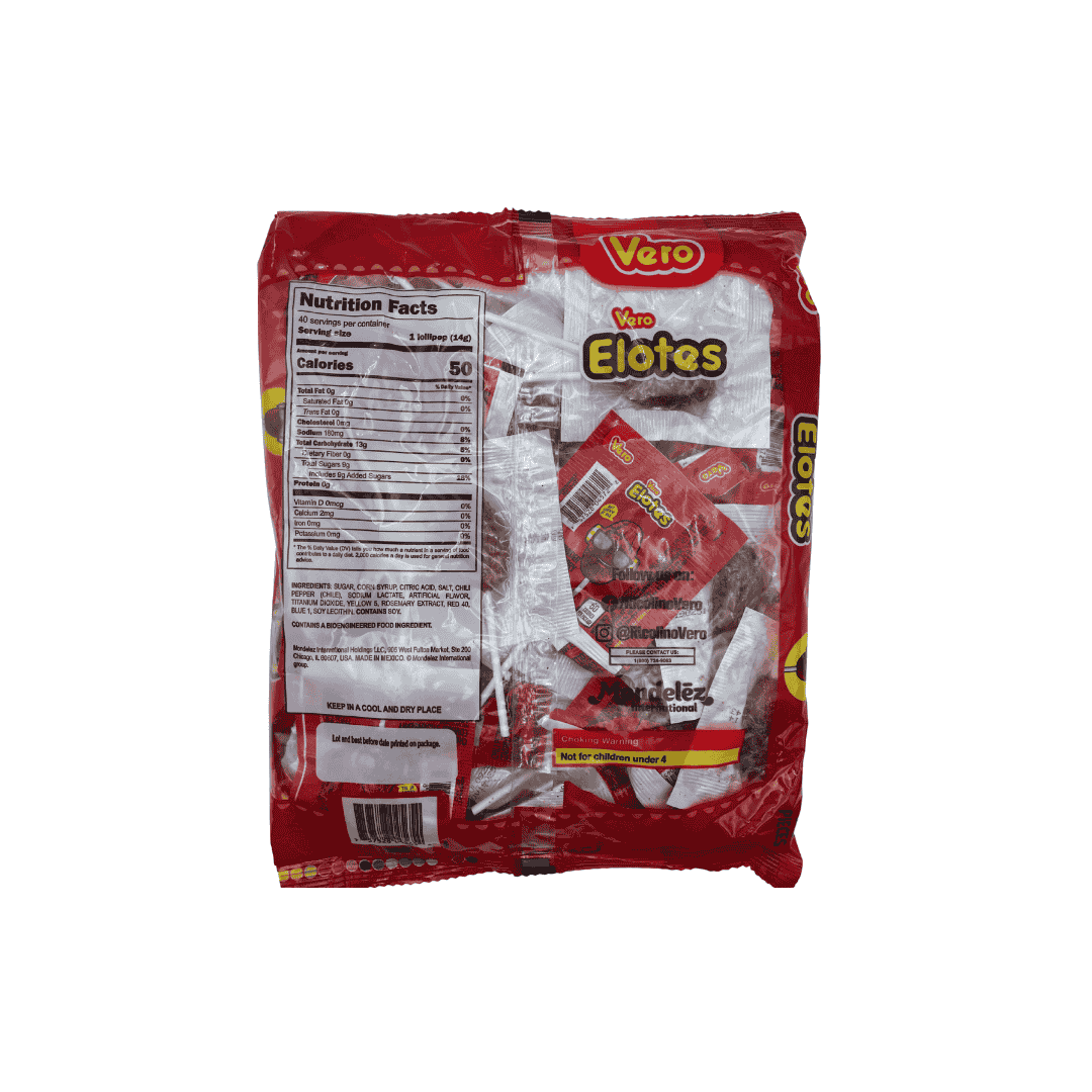 paleta sabor fresa con cobertura de chile, forma de elote. Paquete de 40 piezas de 14 g. peso del paquete 560 g (19.75 oz)