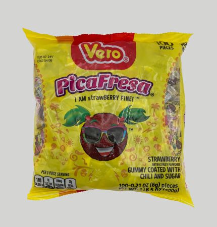 gomas sabor fresa cubiertas de chile y azucar. Bolsa de 100 piezas de 0.21 oz cada una. Peso del paquete 1 lb, 5 oz (600 g)