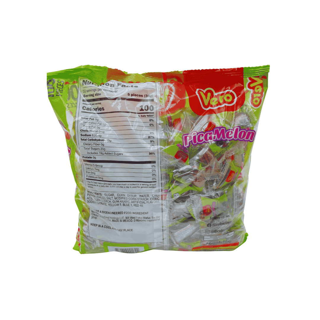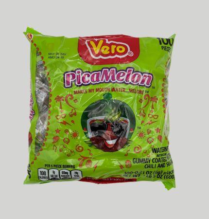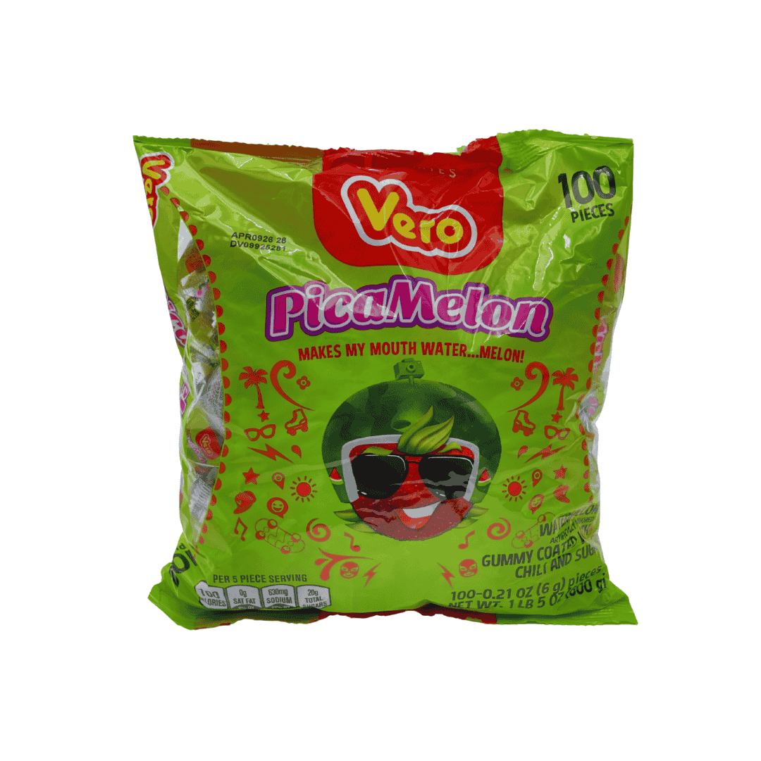 gomas sabor sandia cubiertas de chile y azucar. Bolsa de 100 piezas de 0.21 oz cada una. Peso del paquete 1 lb, 5 oz (600 g)